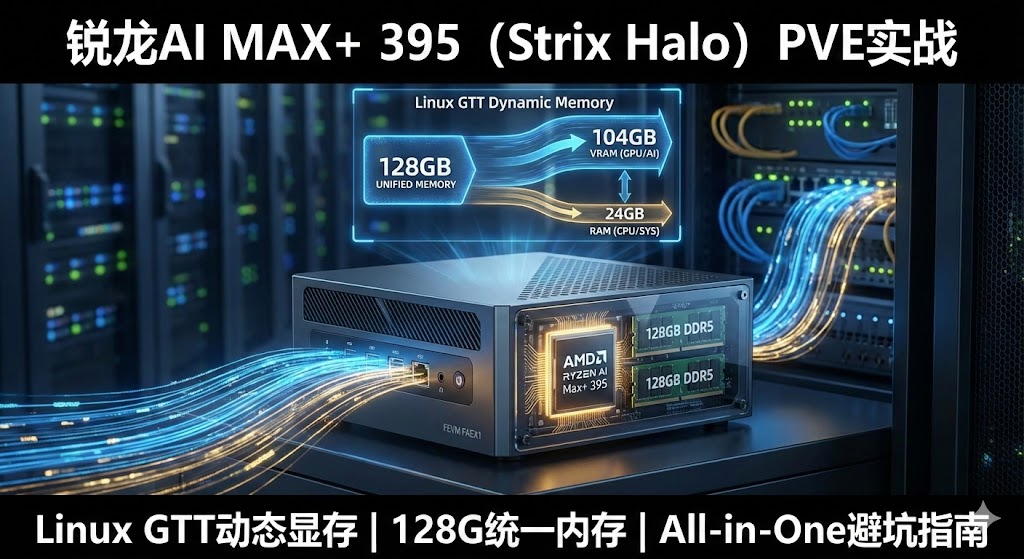 于是,博主决定采用 Proxmox (PVE) 系统,利用 Linux LXC 容器来部署上述服务。这种方案的便利在于:只需在 BIOS 里划分 8GB 专用显存,剩下的通过 Linux 的 GTT (Graphics Translation Table) 机制动态映射 96GB。